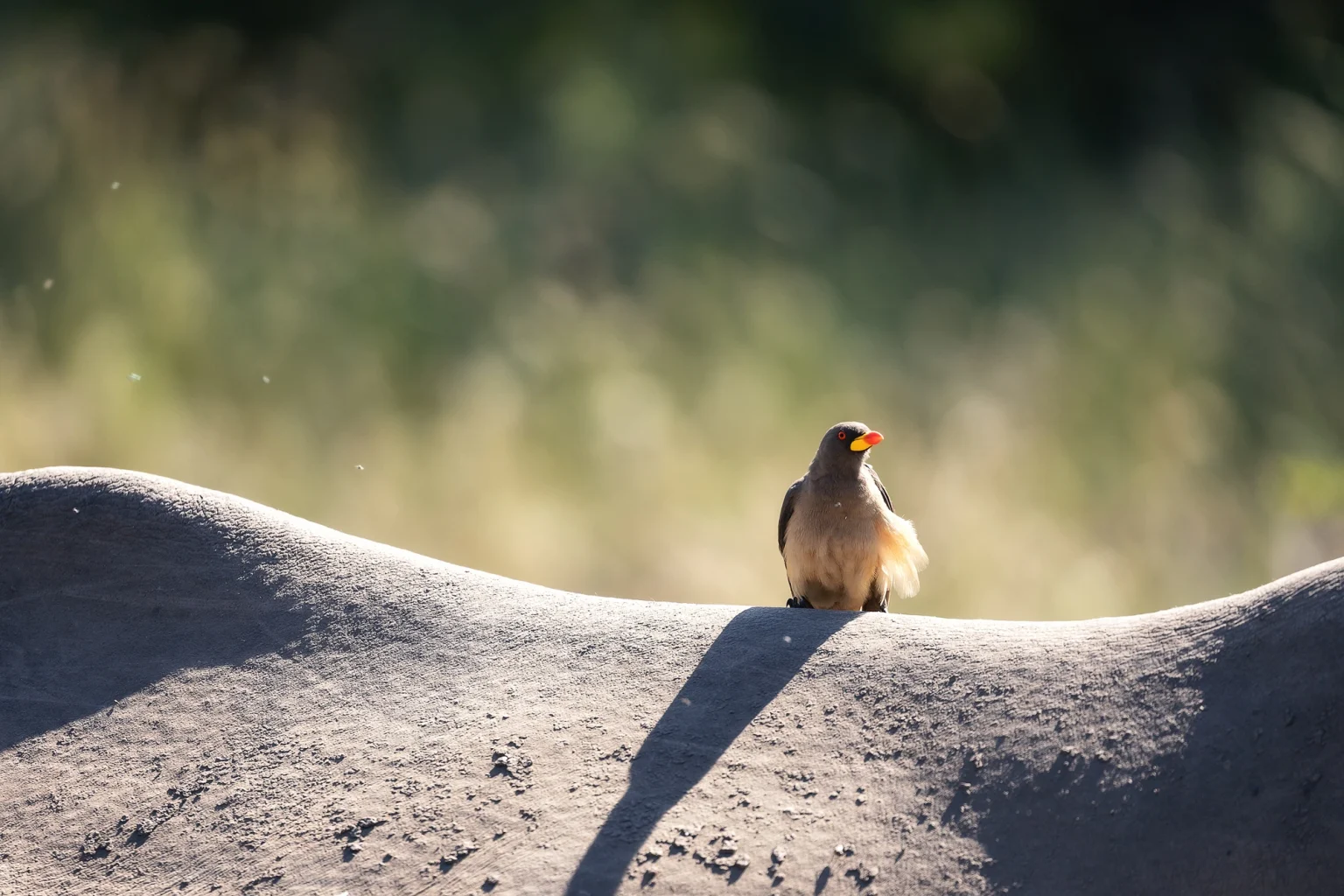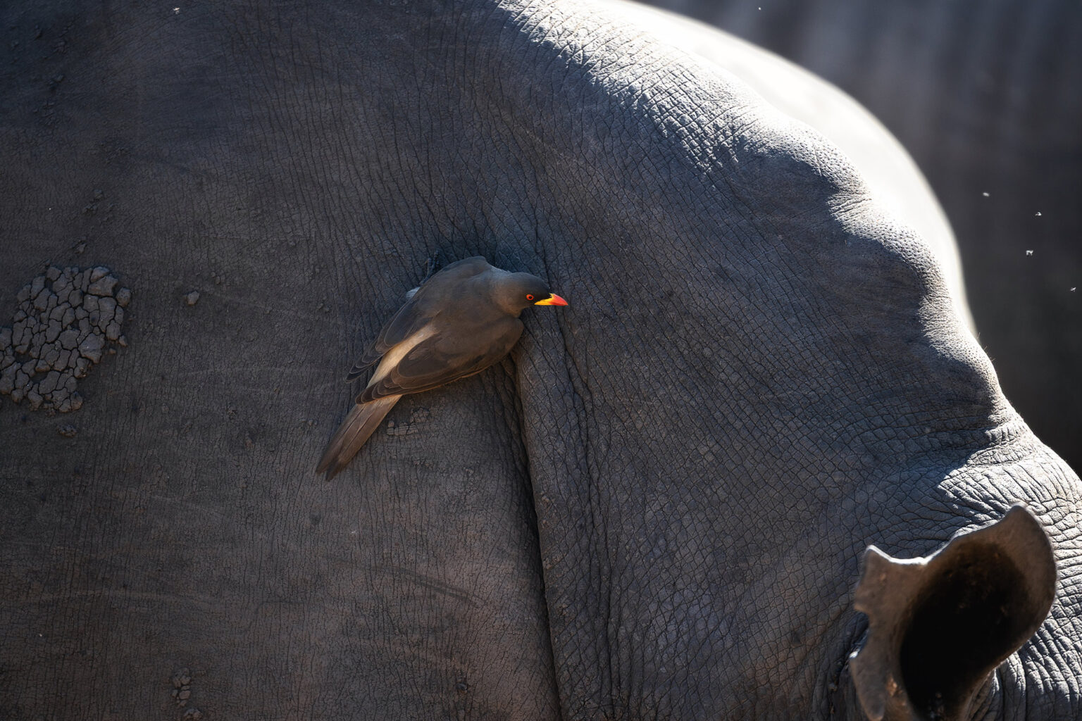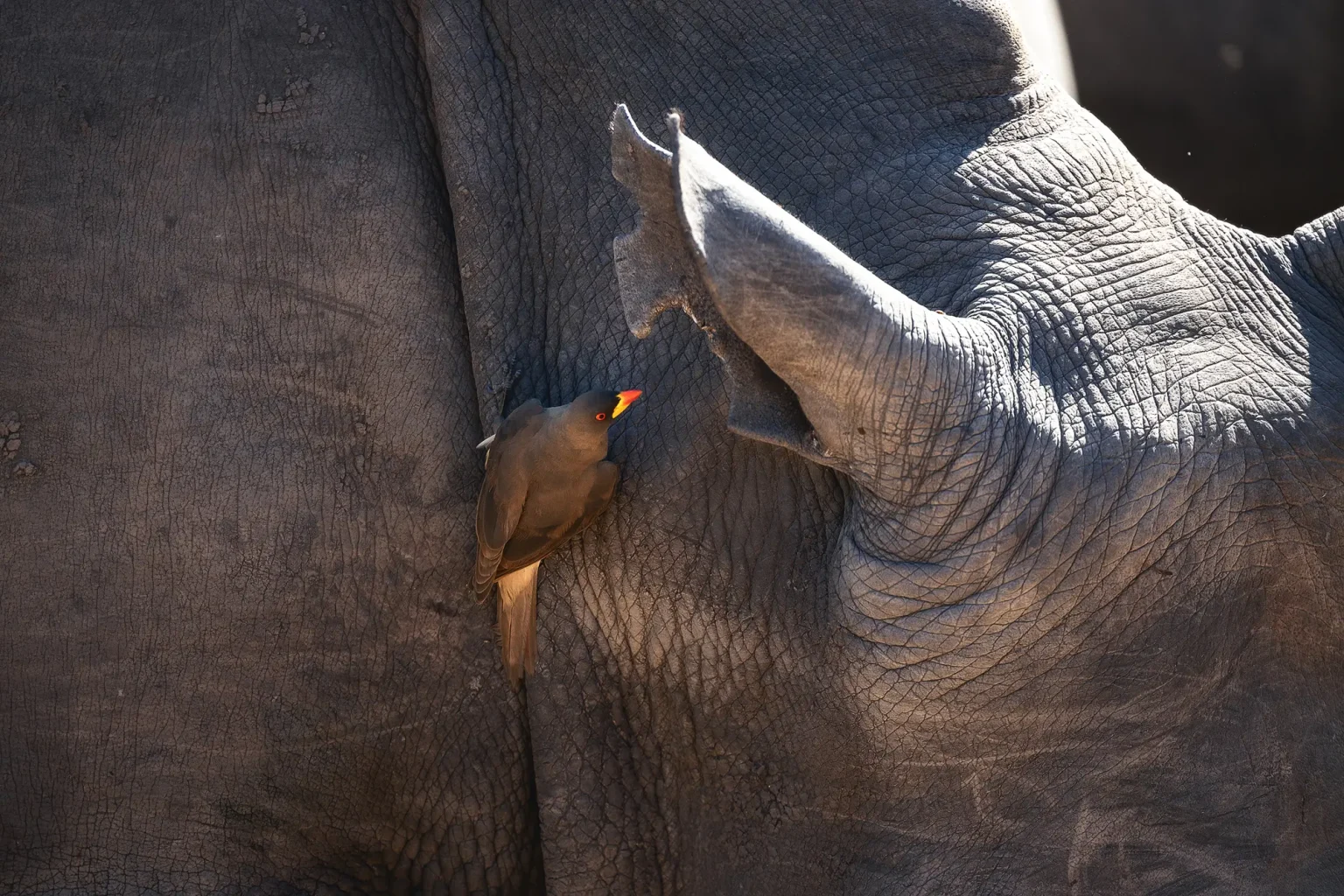 Oxpecker (Madenhacker) auf einem Nashorn